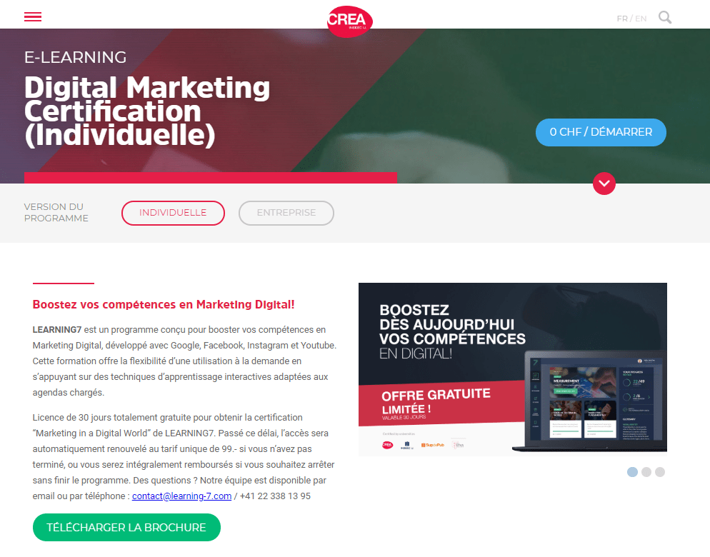 Votre envie est d’améliorer vos compétences et d’approfondir les potentialités offertes par le digital ? Cette formation marketing digital de Créa Genève vous intéressera certainement ! Pendant le confinement, les modules d’apprentissages sont gratuits, vous n’aurez donc pas à débourser les 99 CHF habituellement demandés pour avoir accès à la plateforme d’e-learning. Composée de 7 modules,cette offre d’introduction reprend les fondamentaux du marketing digital, le planning stratégique, les formats, les plateformes ou encore les campagnes de brand building. La mise à disposition d’un dashboard vous permet de suivre votre progression et de consulter vos résultats. De plus, des experts locaux interviennent dans des vidéos très agréables à suivre. Gros plus de la formation : un glossaire de 400 termes marketing et une fonction prise de notes!