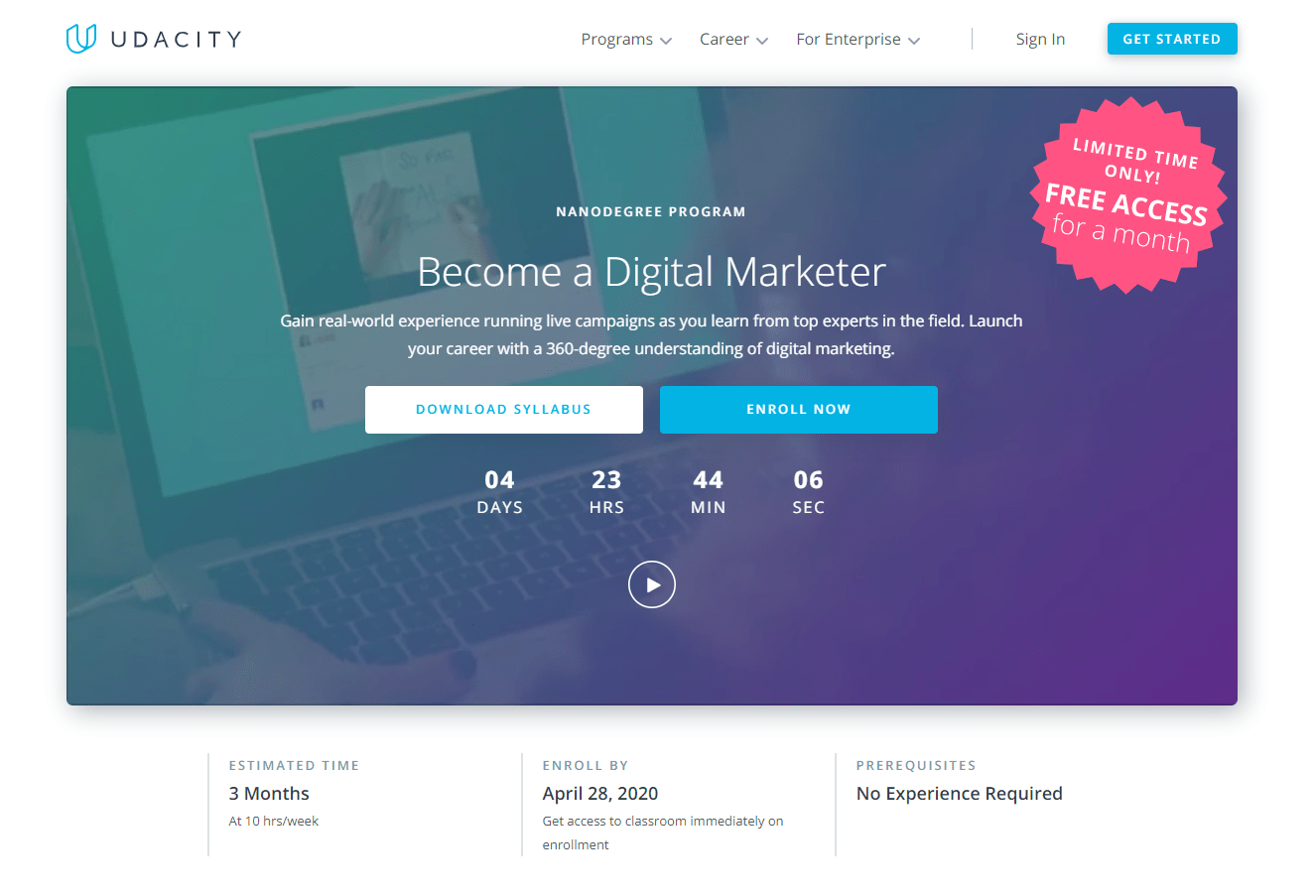 On passe maintenant à un contenu plus dense! La formation marketing web d’Udacity. Cette vous permettra d’acquérir de solides connaissances. La célèbre plateforme d’e-learning vous propose de suivre 9 cours à raison de 10 heures de travail par semaine pendant 3 mois. Vous reverrez les fondamentaux du marketing mais le SEO, le contenu, les campagnes ads ou encore l’utilisation de google Analytics. Un syllabus (en langue anglaise) vous présentera avec soin et détails le contenu riche de ces cours en ligne. Signalons que la plateforme propose actuellement une offre spéciale, puisque le premier mois est offert.