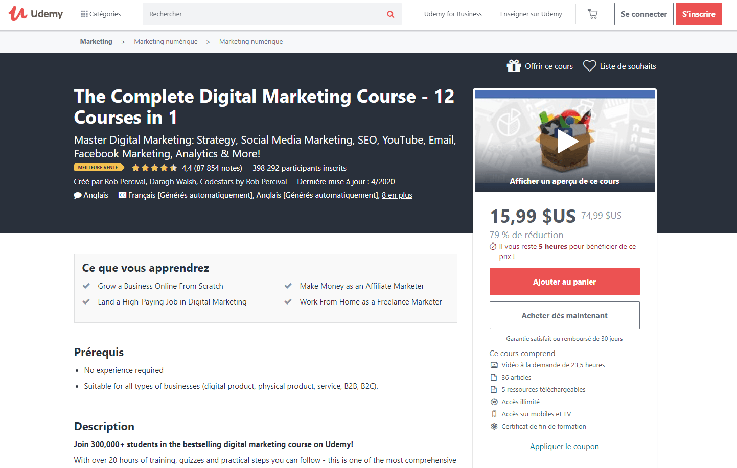 Ce sont près de 200’000 étudiants qui se sont laissés séduire par « The complete Digital Marketing course » d’Udemy. Pas de doute, cette formation est de qualité ! Comme son nom l’indique, ce « learning by doing » vous offrira un contenu exhaustif et diversifié. Pas besoin de pré-requis, vous serez initié au copywriting en passant par le SEO mais également à la réalisation rapide d’un site web « WordPress ». Enfin, vous apprendrez à optimiser les contenus sur Youtube ou Linkedin. Le tout de manière ludique à l’aide de vidéos, quiz et exercices pratiques. Udemy vous propose de faire des économies en vous offrant un rabais de 93% sur cette formation.